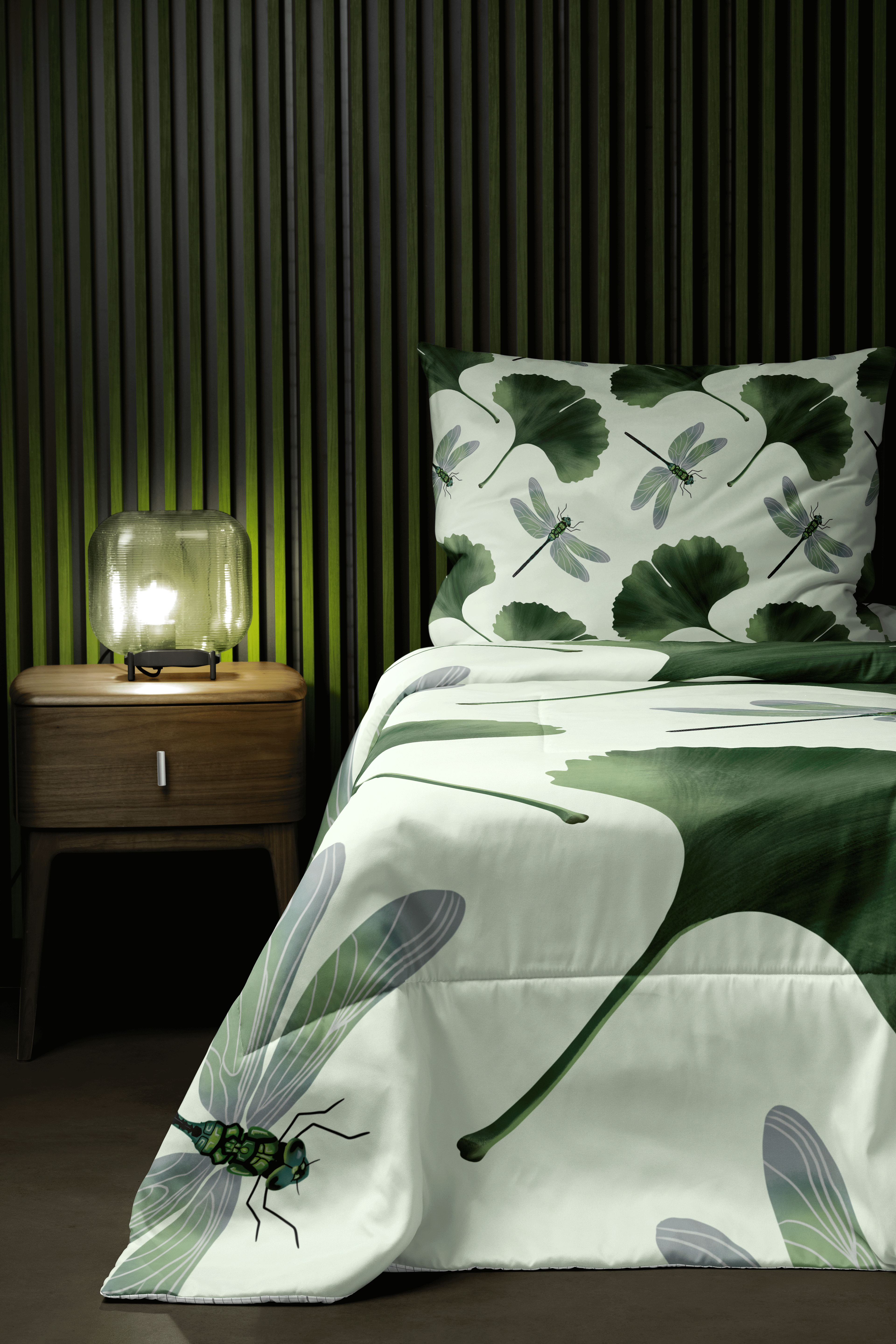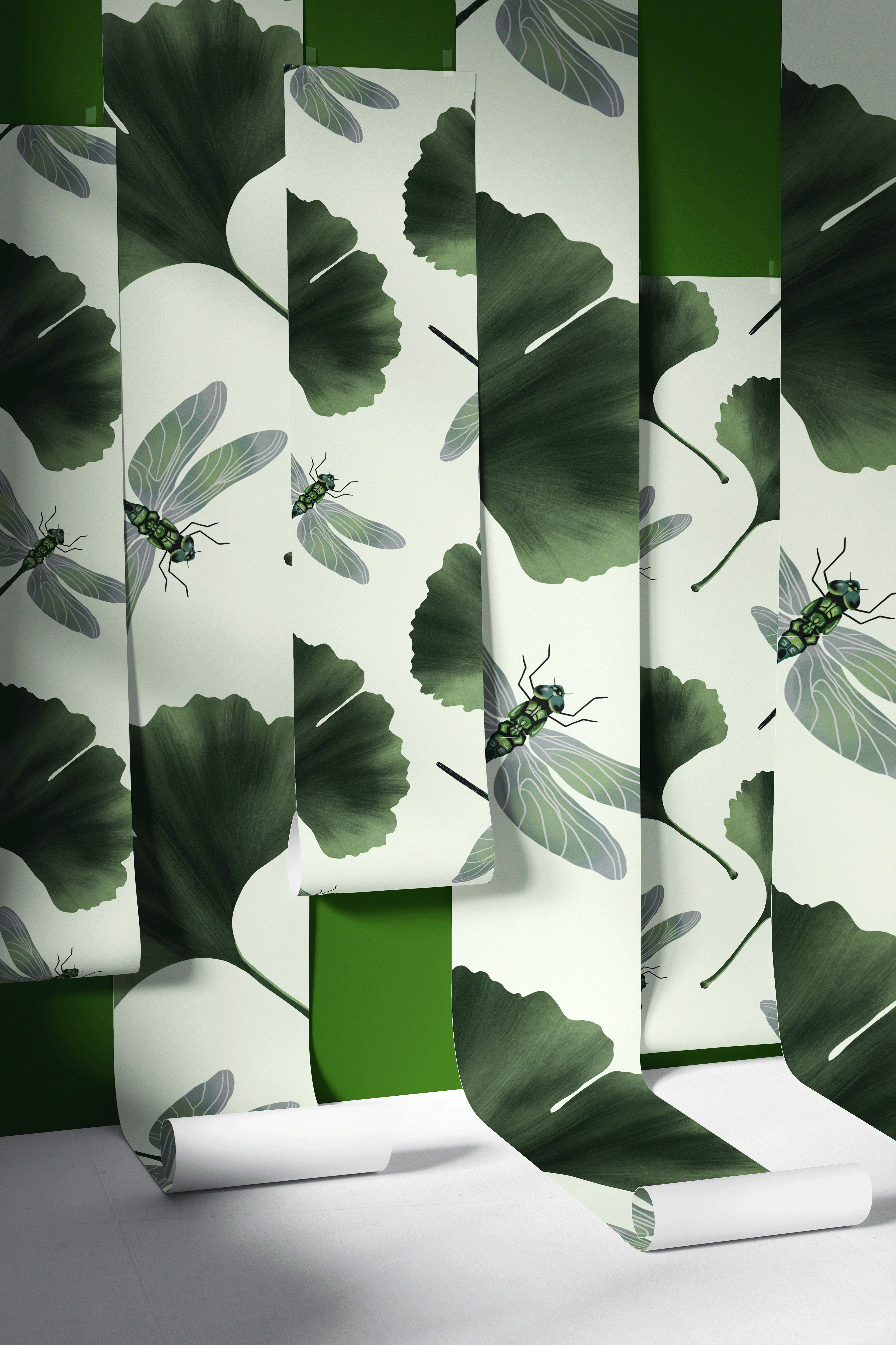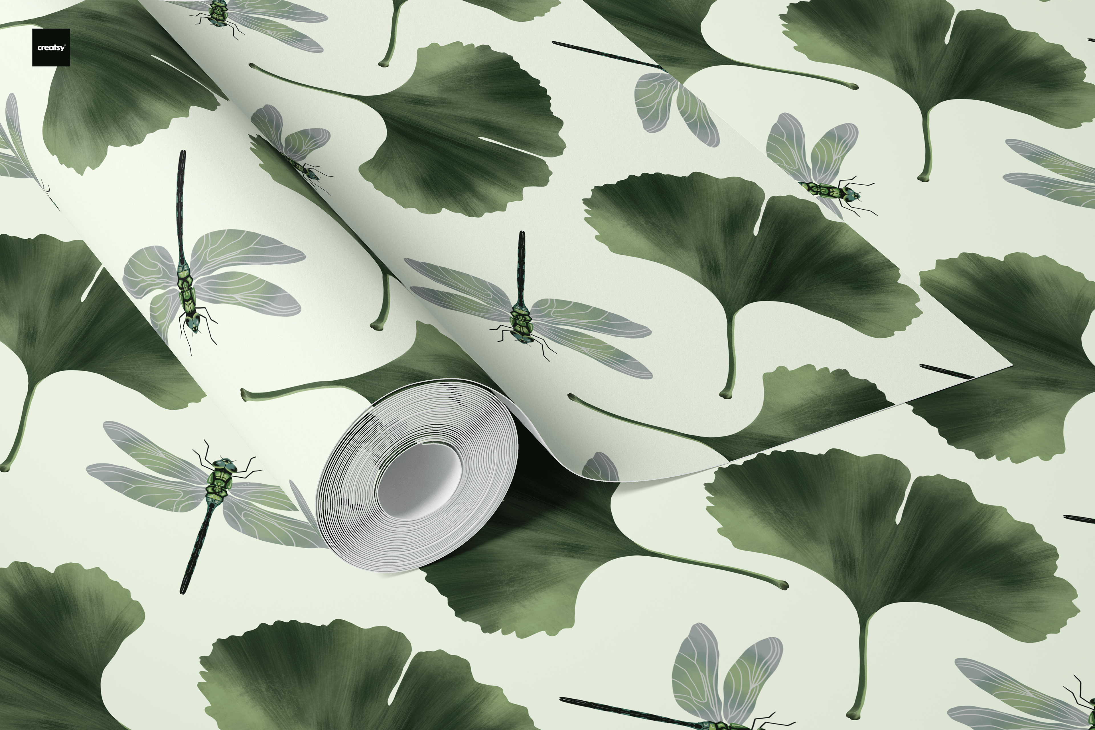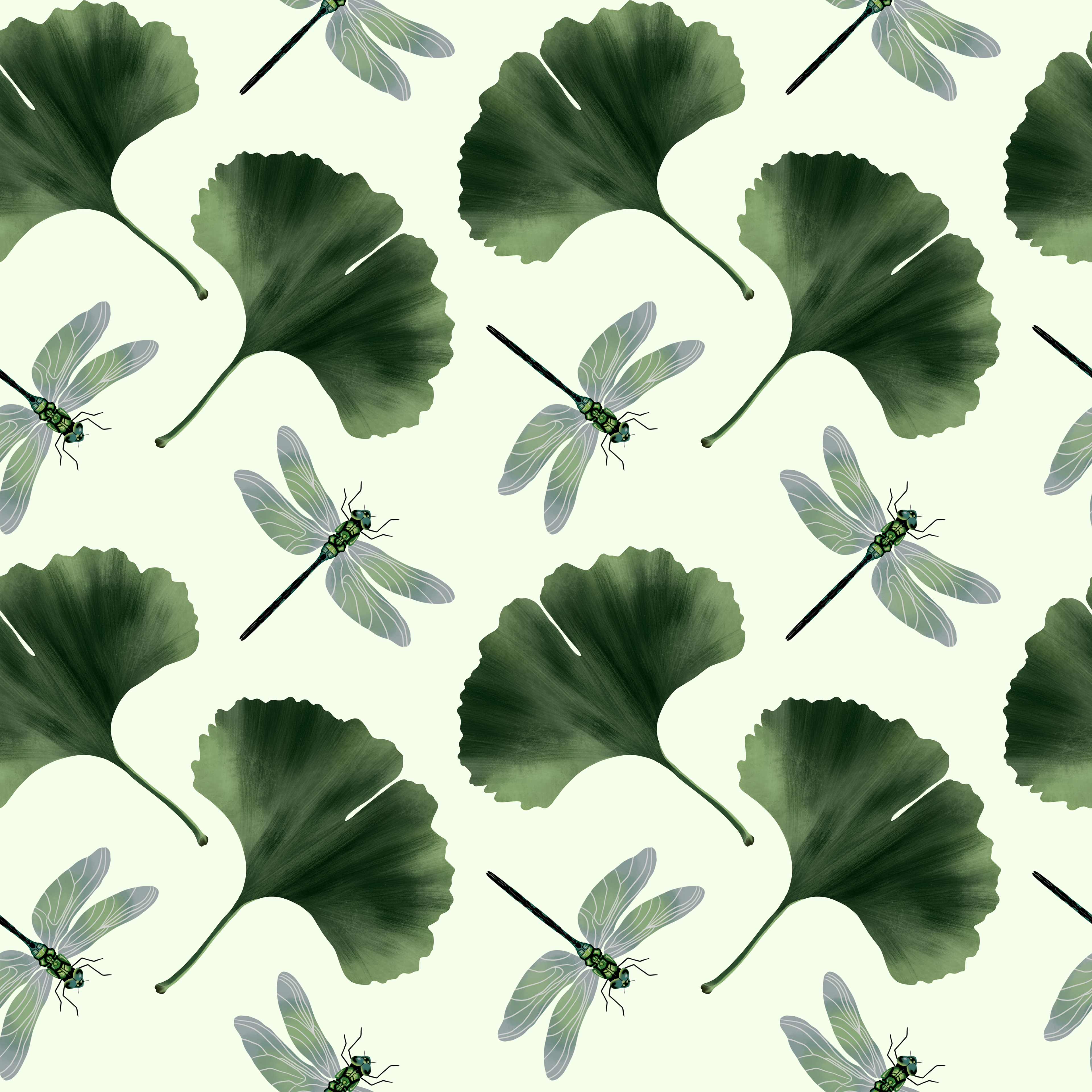 A modern and calming design featuring ginkgo leaves and fireflies, hand-drawn in Procreate. The palette of serene greens with warm, natural tones creates a soothing balance of nature and light. The ginkgo, a symbol of longevity and peace, pairs beautifully with the quiet magic of fireflies to evoke still summer nights and a sense of calm wonder. Perfect for fabrics, wallpaper, or home décor that brings a peaceful, modern botanical touch to any space.