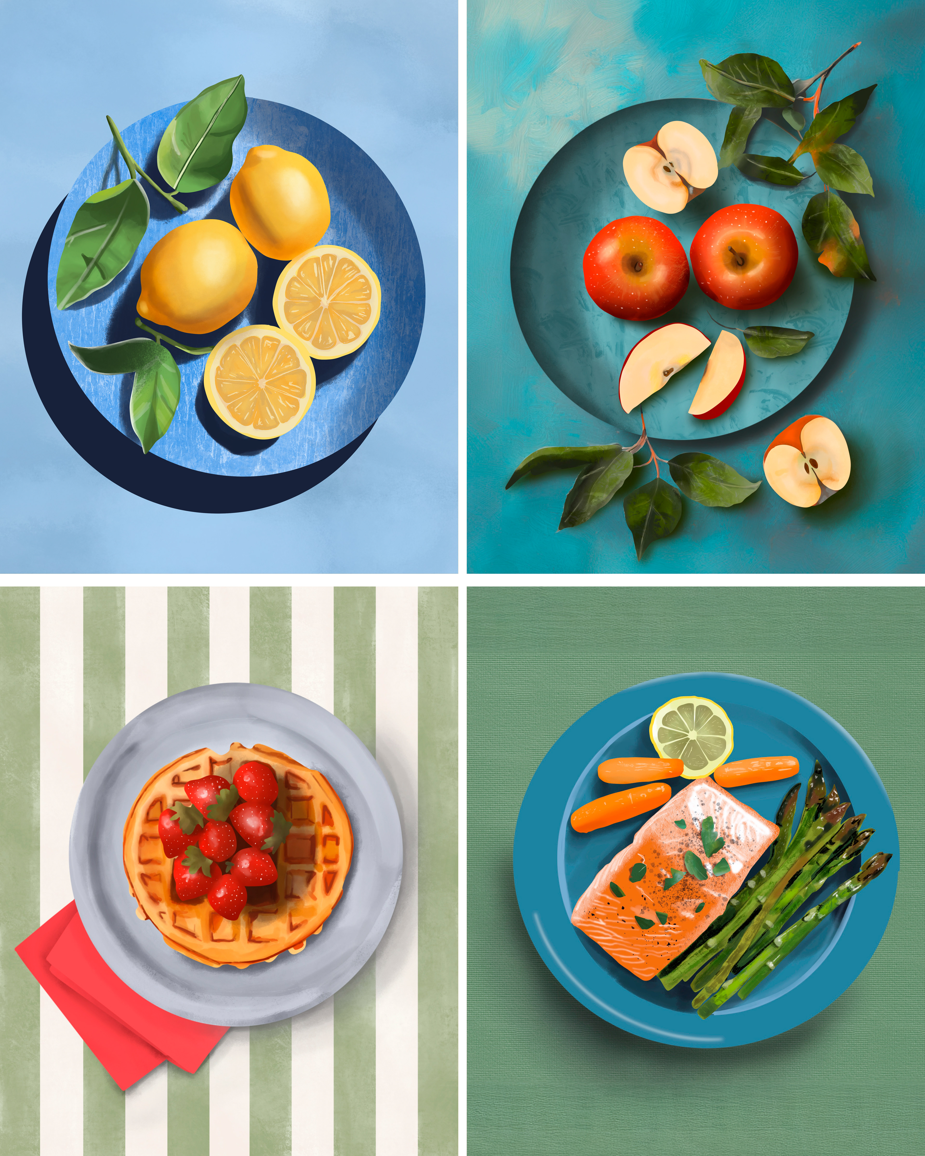 This series brings everyday meals and fruits into a serene, artful focus. Each print captures the quiet beauty of food on a plate—lemons arranged with fresh simplicity, apples rich with natural color, strawberries paired with warm waffles, and salmon presented with refined calm. Together, the collection celebrates the artistry of the table, where nourishment meets design, and calm moments are savored one plate at a time.