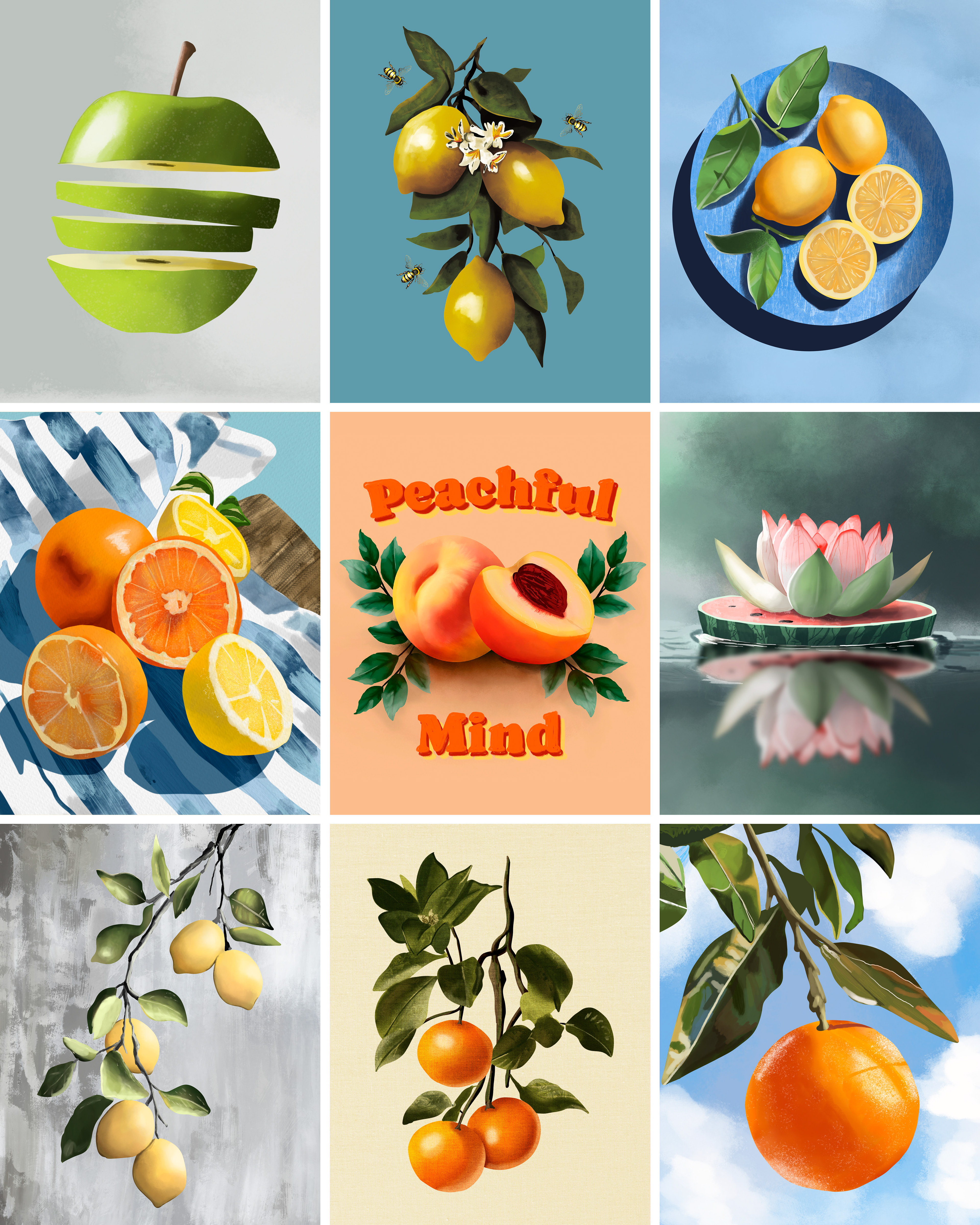 A celebration of quiet abundance, The Calm Grove brings together lemons, oranges, watermelon, and peaches in soft, painterly detail. Each piece is designed to capture the essence of slowing down—moments of sweetness, sunlight, and stillness. With gentle colors and balanced compositions, this collection reflects the serenity of nature’s harvest, offering artwork that transforms everyday spaces into calming retreats.