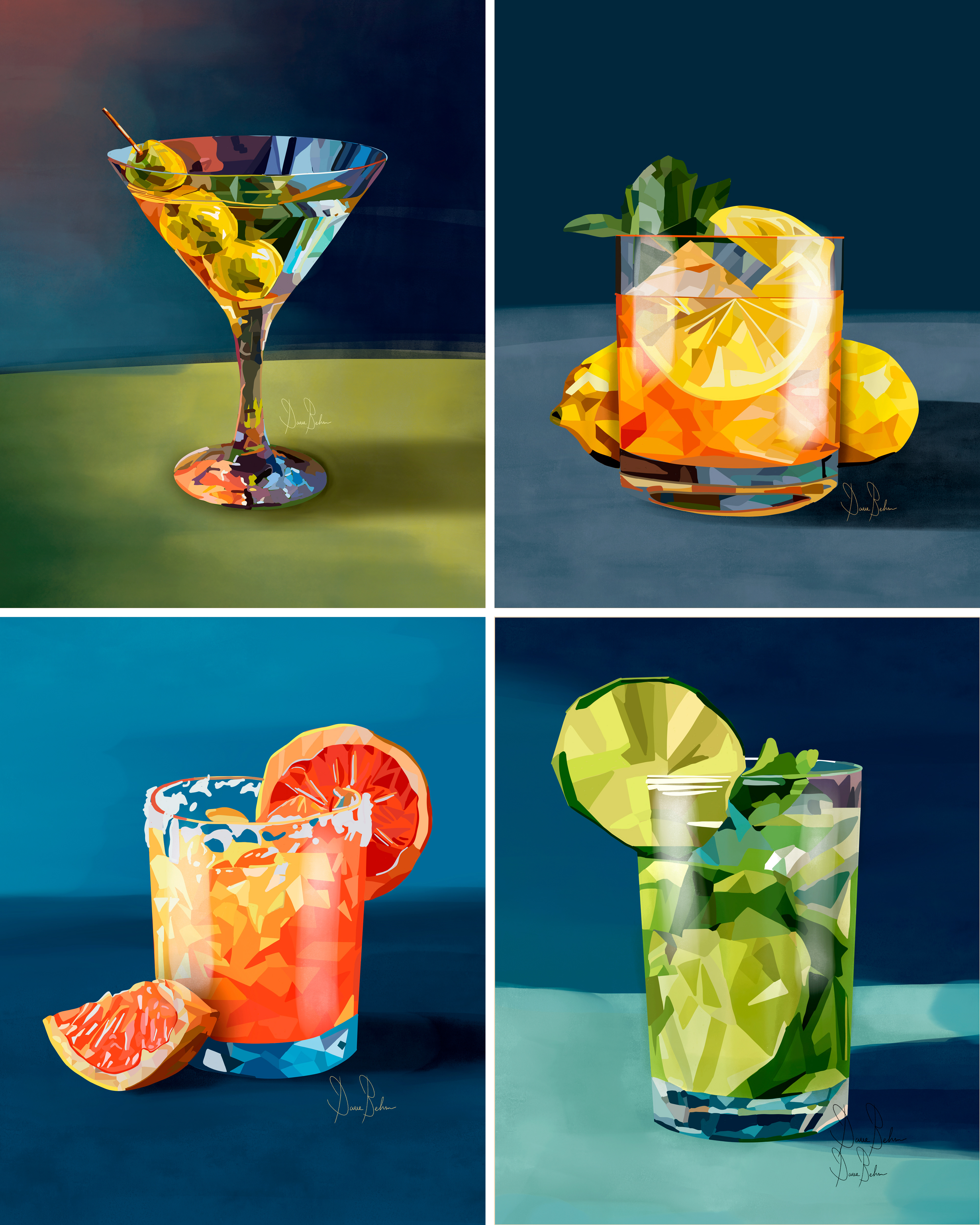 From the crisp elegance of the Dirty Martini to the vibrant energy of the Tangerine Margarita, the nostalgic charm of the Spiked Arnold Palmer, and the refreshing brightness of the Key Lime Mojito, this collection balances sophistication with approachability. The artwork is designed to evoke mood — warm evenings, casual gatherings, summer patios, and elevated everyday moments.